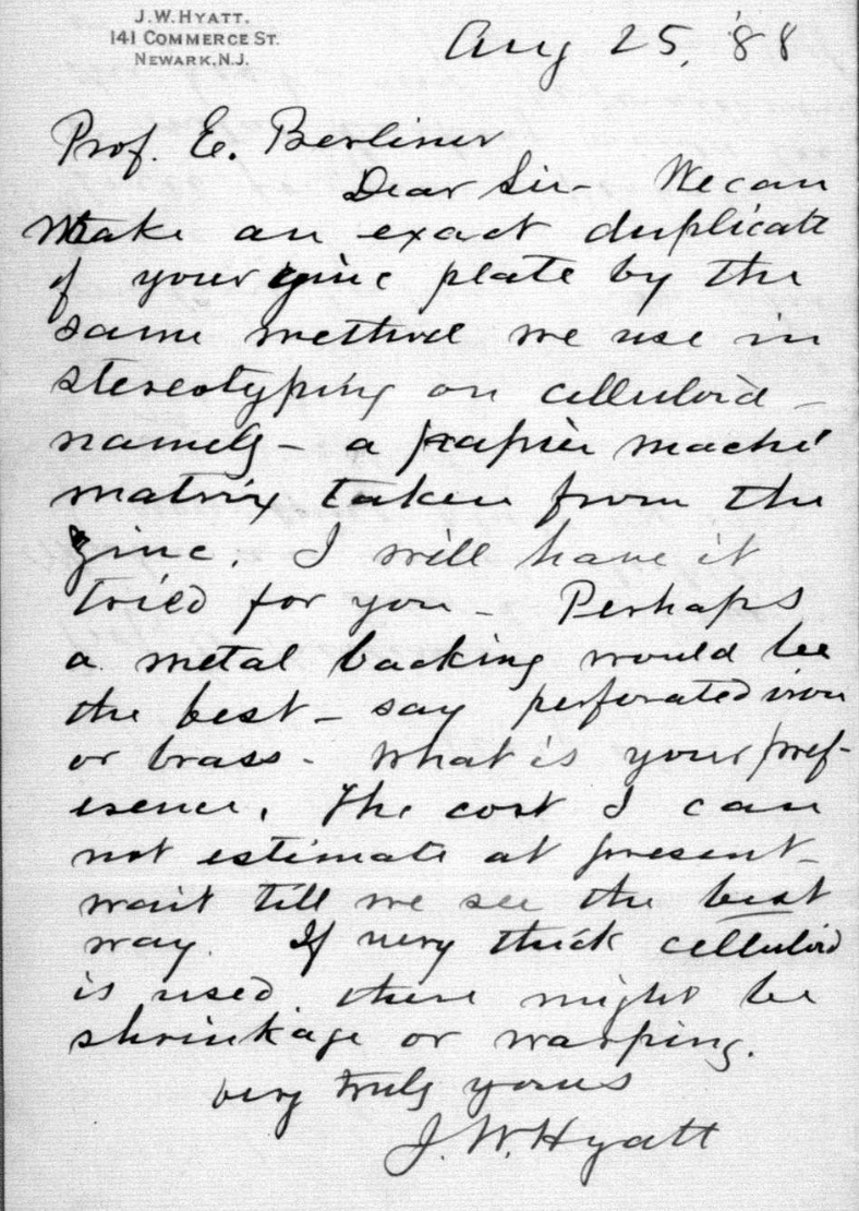Letter written by John Welsey Hyatt Aug, 25, 1888