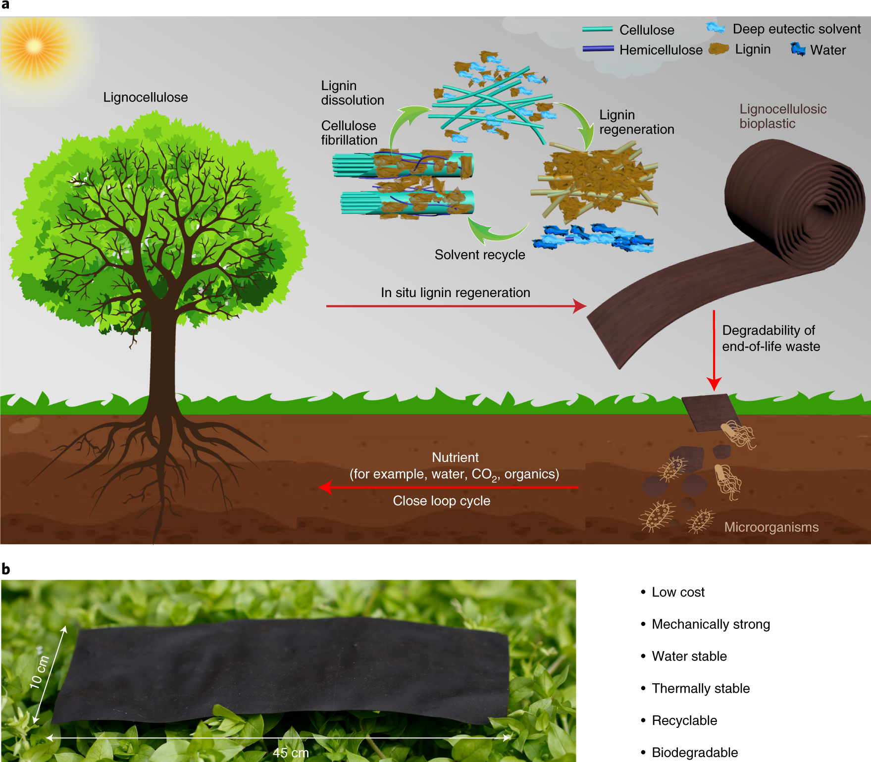 Right: "A strong, biodegradable and recyclable lignocellulosic bioplastic" (Nature Sustainability)